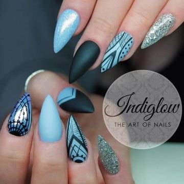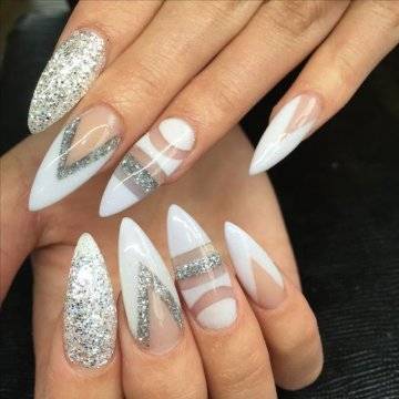 Оригинавльный маникюр форма стилет, блестки, графический дизайн, пирсинг на ногтях.