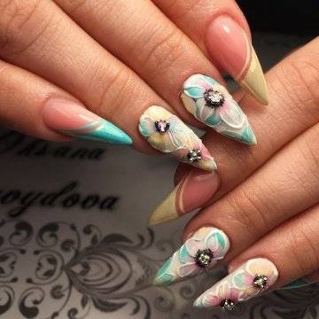 Ногти стилет нарощеные, покрыты гель лаком, украшены все ногти рисунком цветы, и стразы.