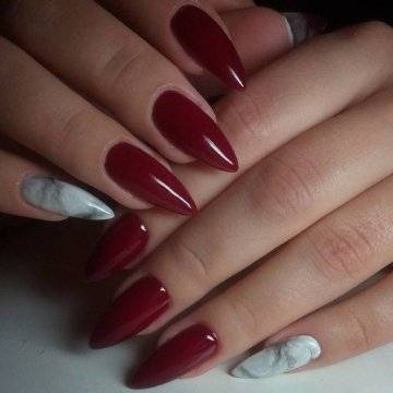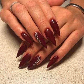 Бордовый гель лак, острые ногти стилет, золотой френч.