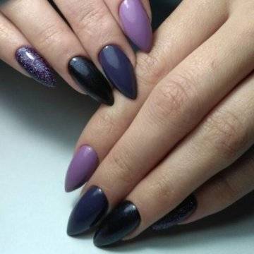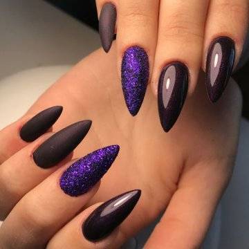 Острые ногти формы стилет, блестки, матовые черные ногти.