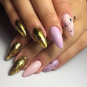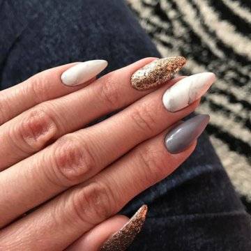 Маникюр на ногтях стилет, блестки, мраморный маникюр, стразы, полоски золотые.