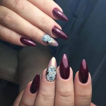 Осенью 2021 года маникюр можно дополнить поролоновым дизайном ногтей в лучших цветах сезона: бордовом, синем, черном и фиолетовом.