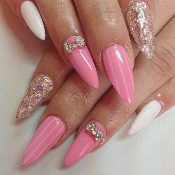 Острые ногти, много блесток, стразы, розовый, серый, белый гель лак.