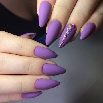 Острые,длиные ногти матовые, форма балерина, стразы.
