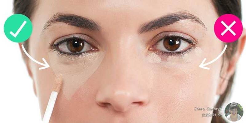 - Отдельного внимания заслуживает вопрос, как правильно наносить консилер под глаза: поставьте точку по центру щеки и от нее проведите линии к внешнему и внутреннему углам глаза, после чего заштрихуйте полученный треугольник консилером.