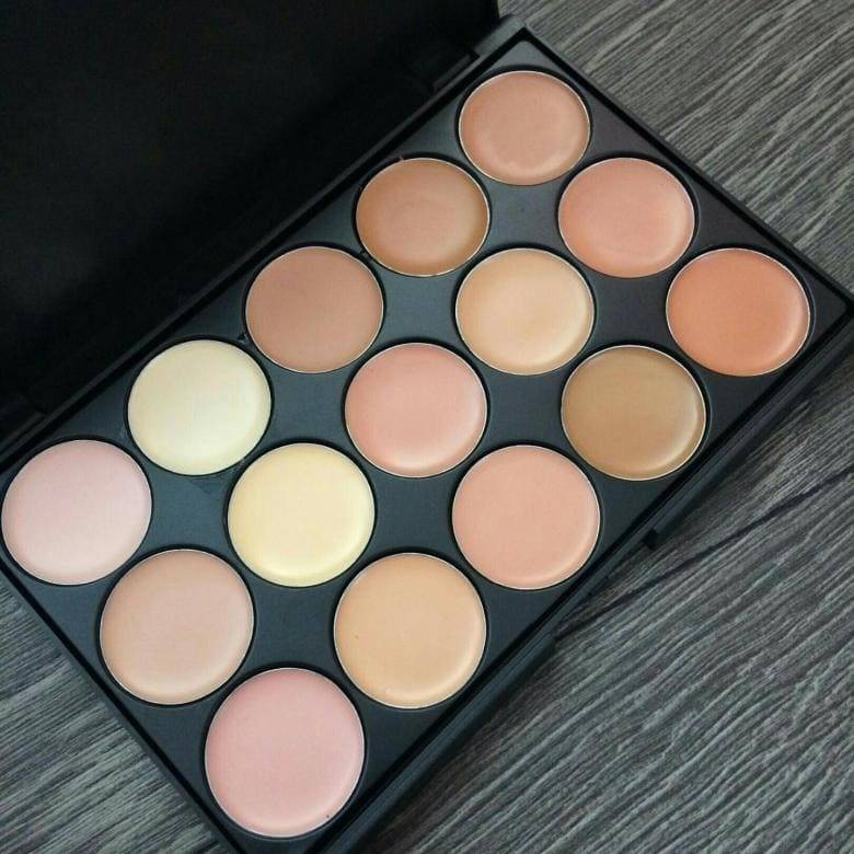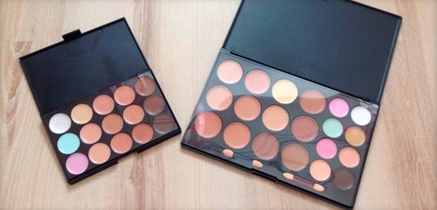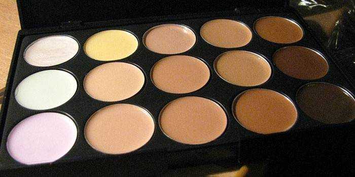 Это самый распространенный вид корректирующего вещества. Визажисты и любители покупают его из-за удобства, универсальности и выгоды. Текстура косметики в таких наборах бывает кремовой или сухой. Под одной крышкой в разных ячейках может находиться от двух до двенадцати (а иногда и больше) разных маскирующих средств. В комплект, как правило, входит хайлайтер, продукты для контурирования и улучшения вида. Среди цветовой палитры можно увидеть оттенки коричневого, телесного, зеленого и розового.