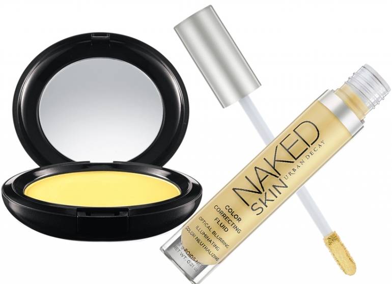 - Желтый корректор прекрасно скрывает дефекты фиолетовых и синеватых оттенков (выступающие вены, синяки). Этот светлый тон визуально смягчает оттенок кожи и делает его более теплым.