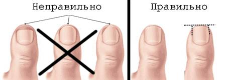- при маникюре или педикюре ногти должны подстригаться правильно. Лучший вариант – квадратная форма с закруглениями по краям;