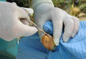 На следующий после операции день тампон, закрывающий рану, удаляется. Для этого необходимо некоторое время подержать прооперированную конечность в теплой (но не в горячей!) воде, после чего, сняв бинт, резко и решительно, но аккуратно сорвать тампон. Затем следует тщательно промыть рану, обработав ее перманганатом калия, и вновь сделать перевязку с обязательным использованием стерильной ваты. Это действие рекомендуется проводить одну неделю – дважды в сутки.