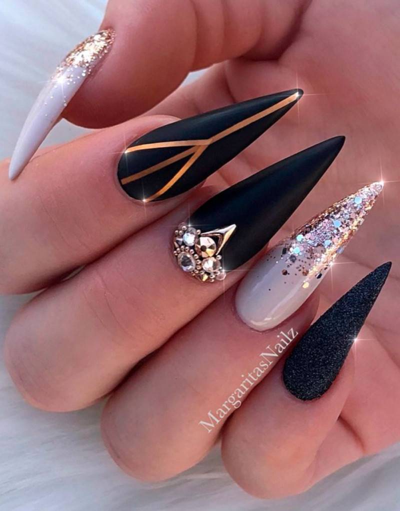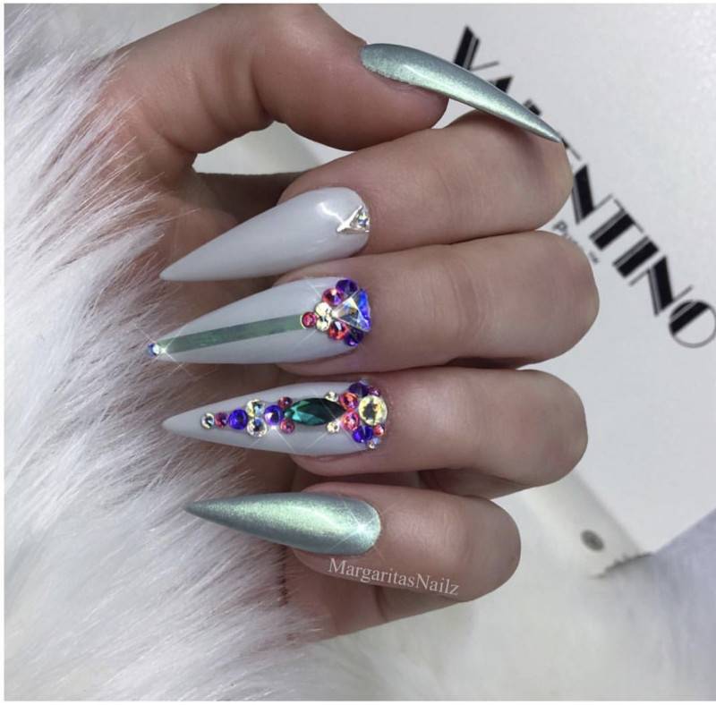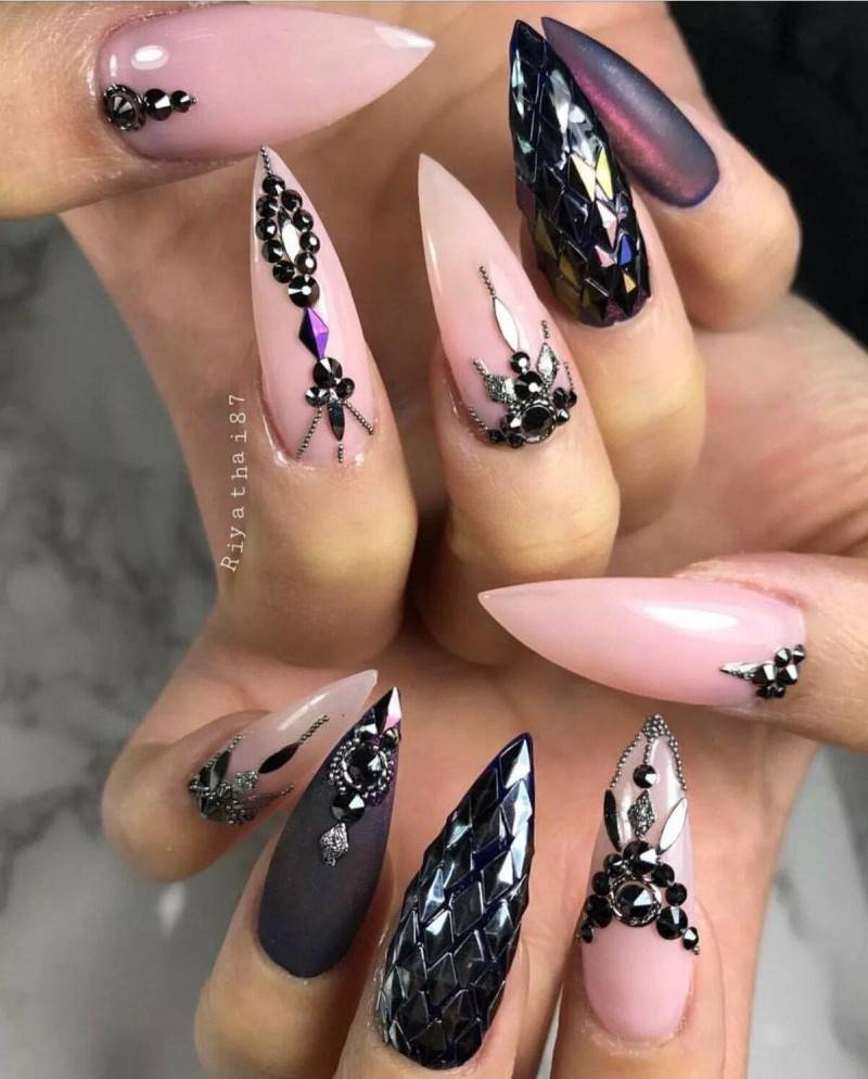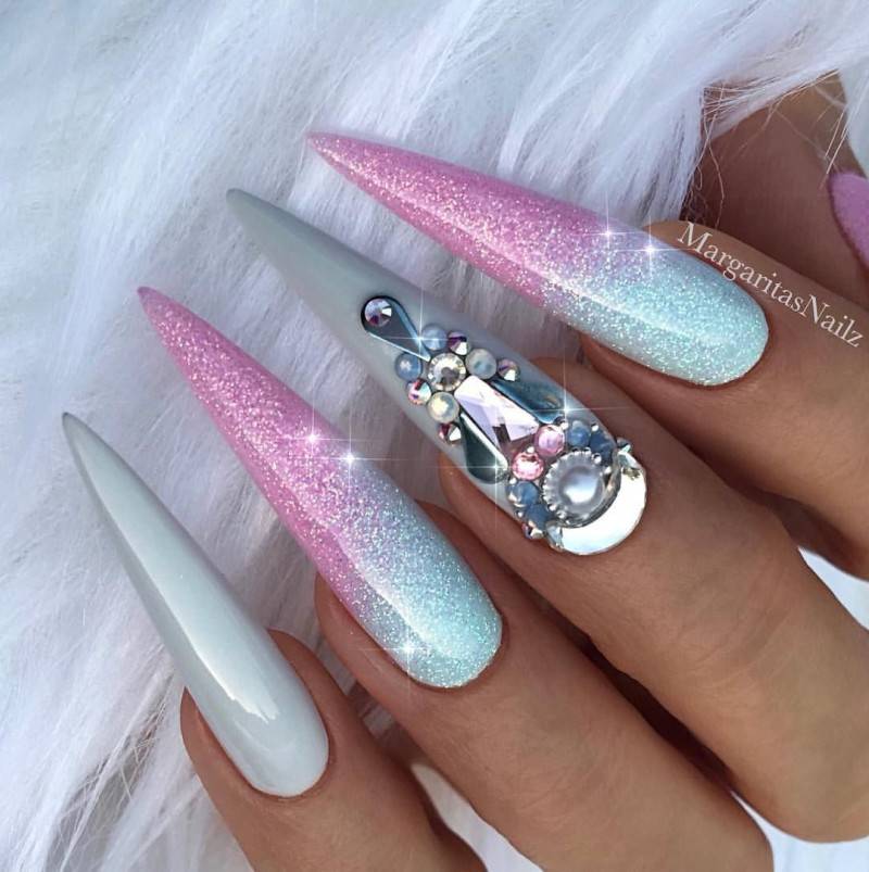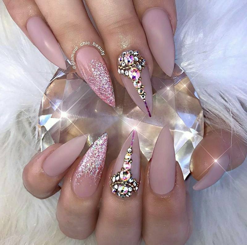 Красивый маникюр на длинные ногти со стразами и блёстками