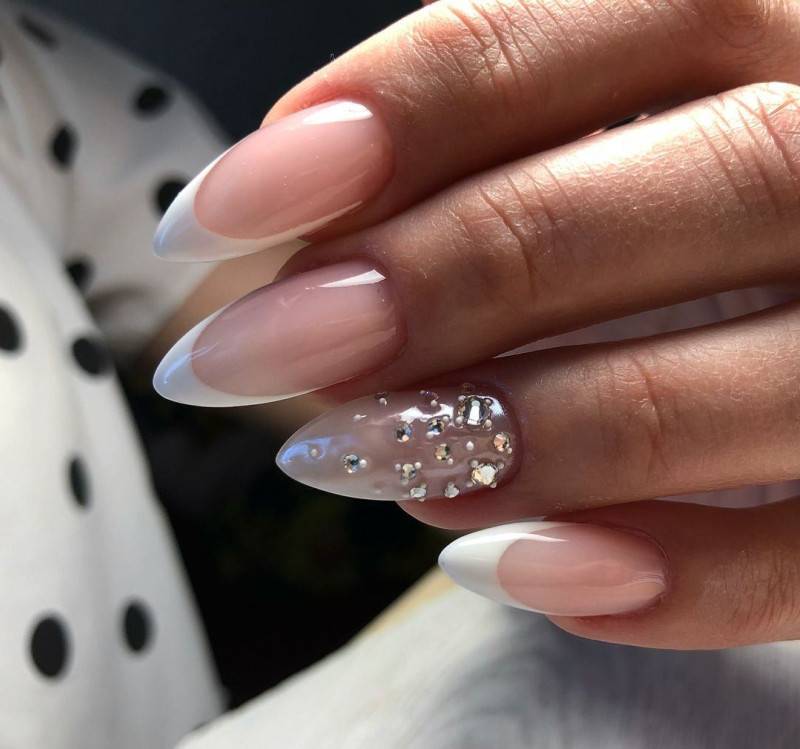 В новом сезоне по-прежнему популярны классические французские ногти. Однако стилисты рекомендуют разбавлять их красивым блеском. Можно использовать камни любого цвета и размера. Опытные мастера рекомендуют украшать только безымянные пальцы. В этом случае дизайн ногтей не столь изыскан, как мог бы быть, и является неудачным.
