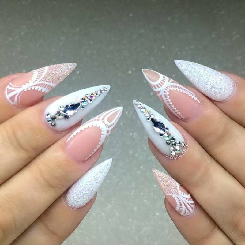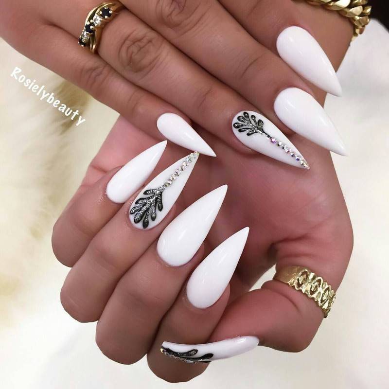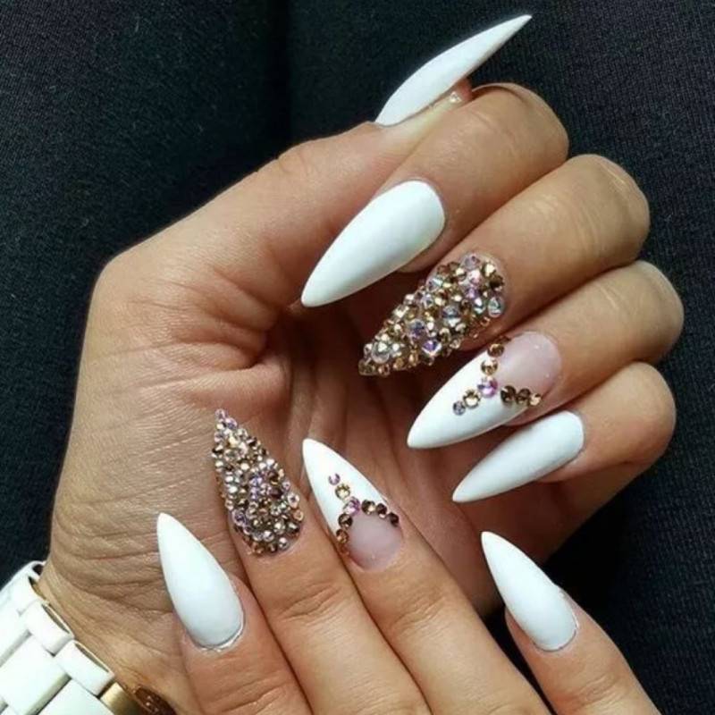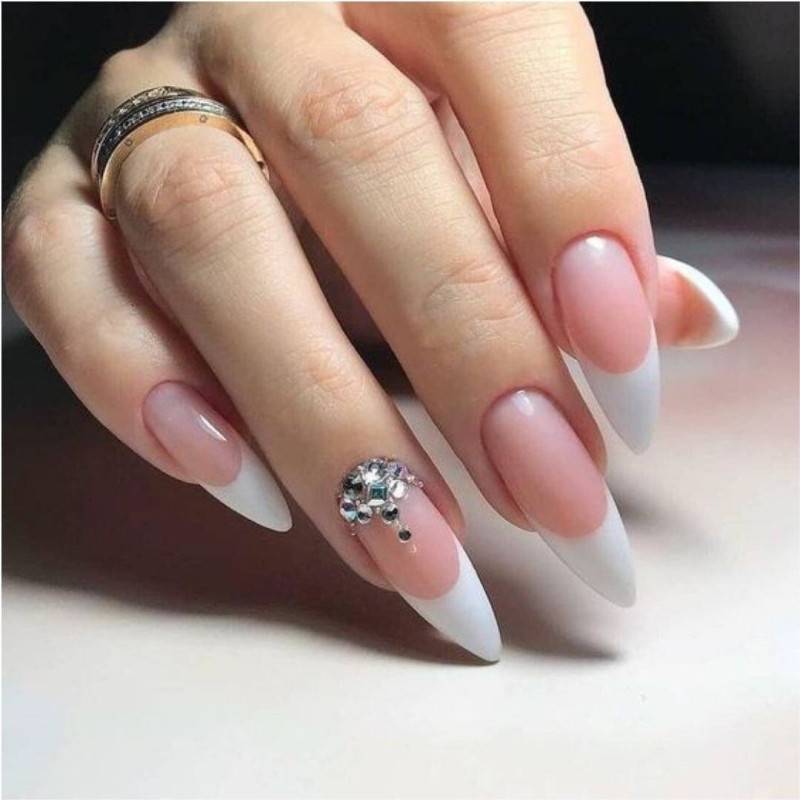 Еще один беспроигрышный вариант маникюра. Белый — это чистая база, на которой узор из камней смотрится свежо и интересно. И не стоит отдавать предпочтение только серебристым камням, выбирайте любой оттенок.