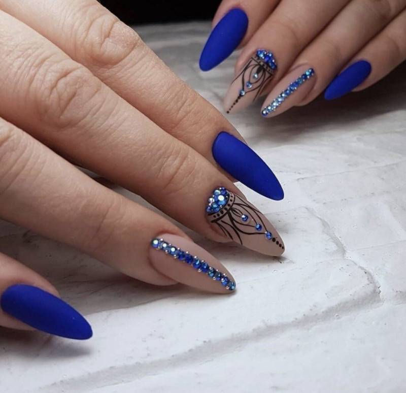 Синяя палитра — лучшее решение для сочетания с серебристым блеском страз. Выбирайте холодные оттенки, чтобы создать стильный маникюр. Если отдаете предпочтение теплым оттенкам, выбирайте золотистые стразы или цветные.