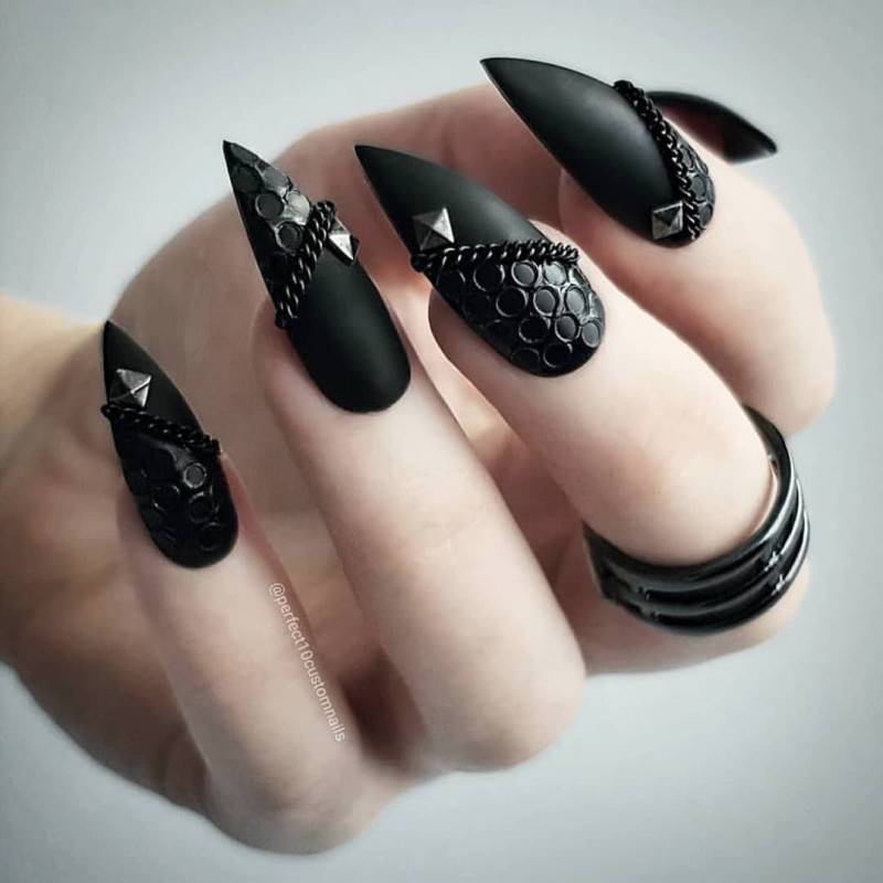 Обладательницы длинных ногтей хорошо знают как облагородить и смягчить свои нейл-арты. Для этого они используют матовую текстуру, меланж, “сахарок” и другой материал, придающий ноготкам бархатистую нежность. Матовый маникюр на острых ногтях может быть выполнен в темных насыщенных оттенках. Чаще всего для дизайна используют бордовый и черный цвета. Стразы располагают классическим способом: в прикорневой зоне, посередине ногтя полоской, поперек ногтя, в виде волны.