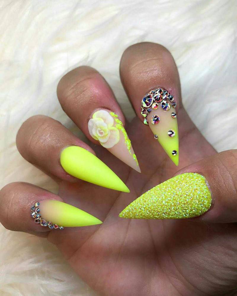 Ногти, окрашенные в мятный и желтый цвета, выглядят модно. Для большей выразительности каждый угол пальца может быть украшен цветными стразами.