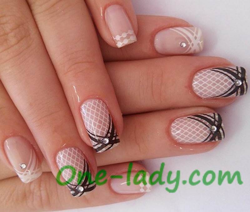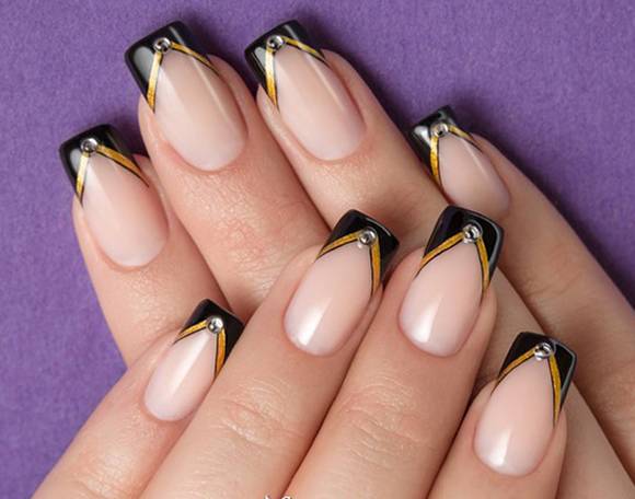 Шеврона, то есть френч с заостренным контуром, хорошо смотрится с черным окончанием, мелкими завитушками золотым лаком и камушками в серединке.