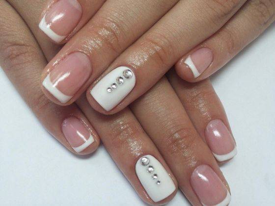 Классический белый маникюр — кончик ногтя белый, глубокая линия «улыбки», по которой выложены прозрачные либо цветные стразы. Если френч цветной, то камни подбираются под цвет покрытия ногтей или контрастного оттенка. В этом случае стоит выделить только один ноготь, чтобы не создать аляповатость.