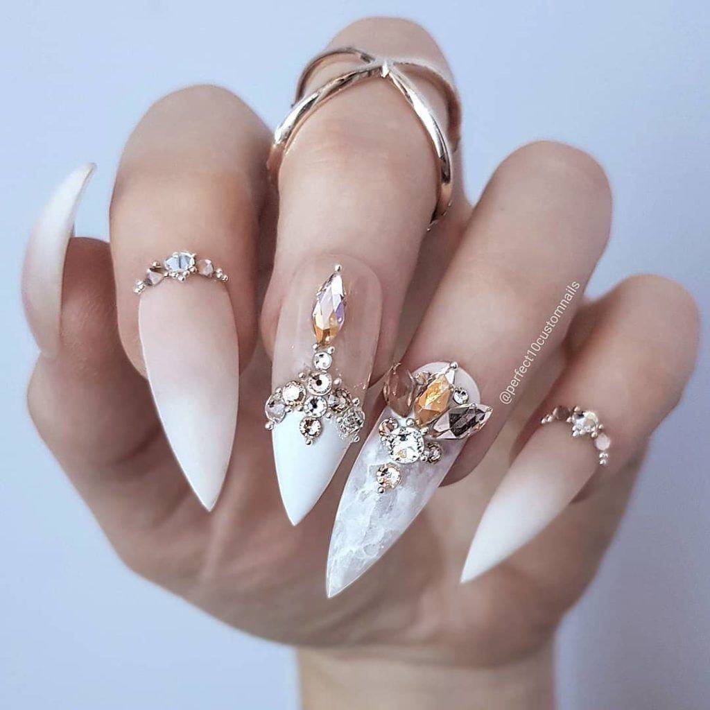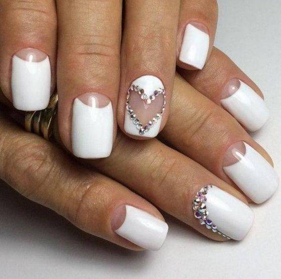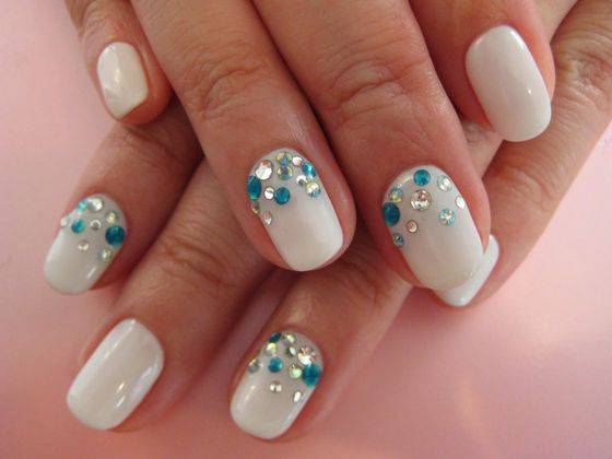 Еще один беспроигрышный вариант маникюра. Белый — это чистая база, на которой узор из камней смотрится свежо и интересно. И не стоит отдавать предпочтение только серебристым камням, выбирайте любой оттенок.