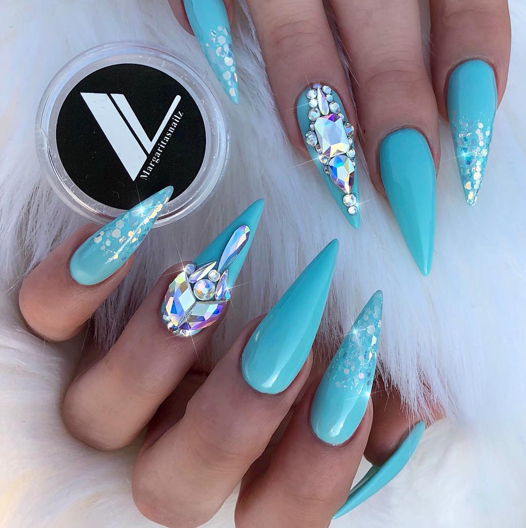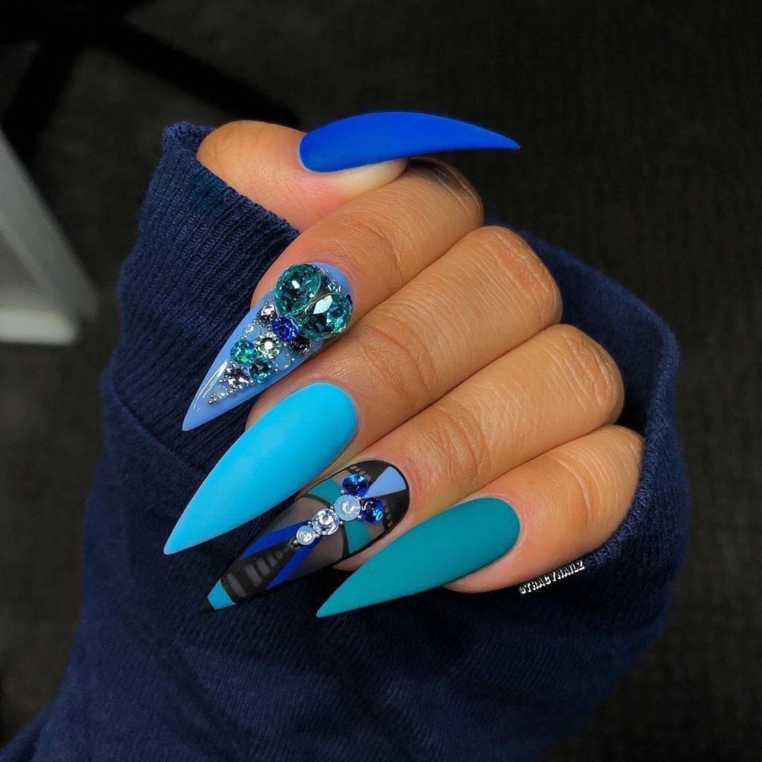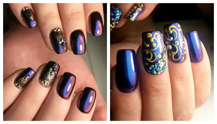 Синяя палитра — лучшее решение для сочетания с серебристым блеском страз. Выбирайте холодные оттенки, чтобы создать стильный маникюр. Если отдаете предпочтение теплым оттенкам, выбирайте золотистые стразы или цветные.