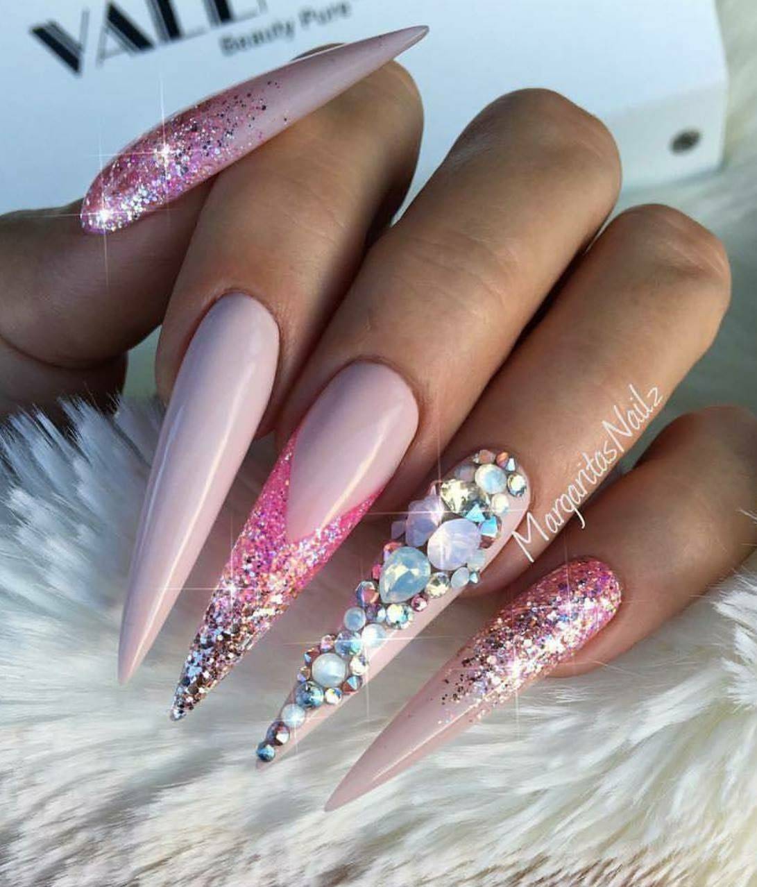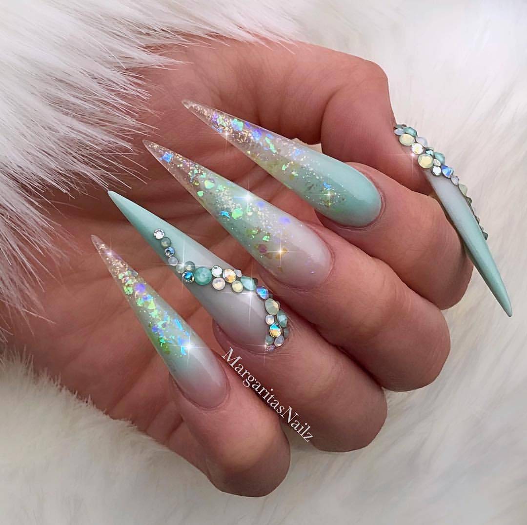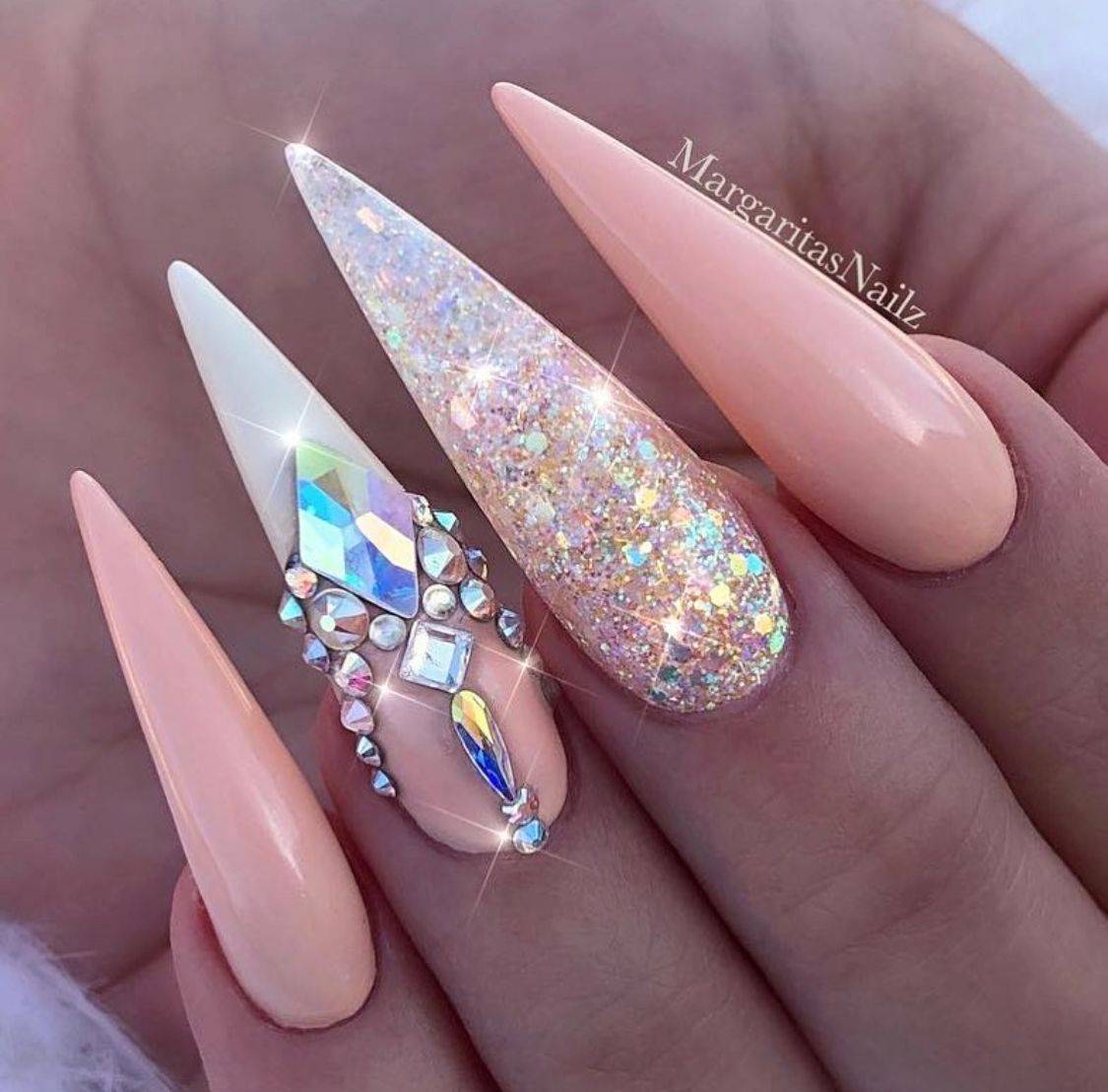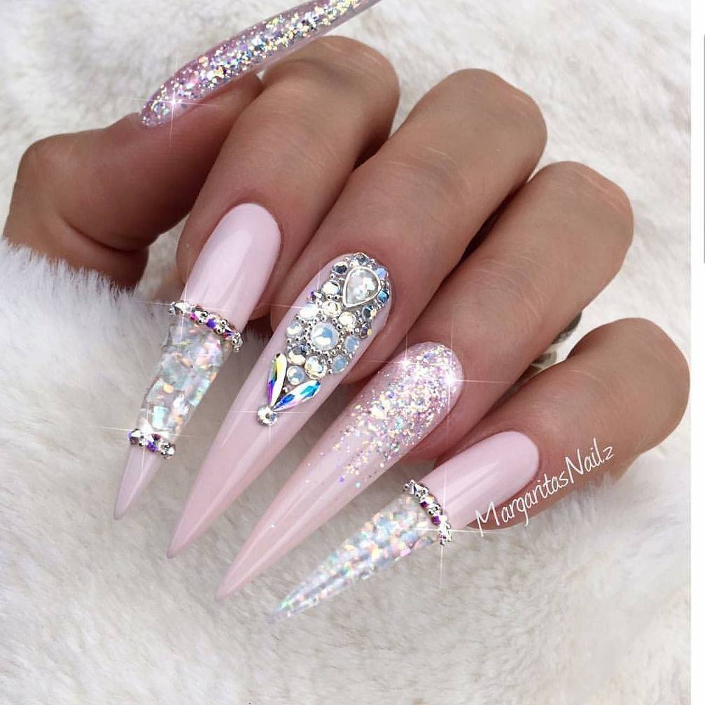 Красивый маникюр на длинные ногти со стразами и блёстками