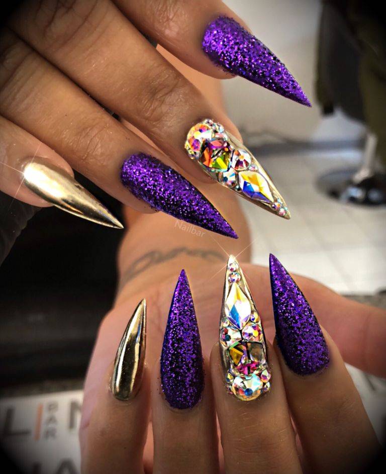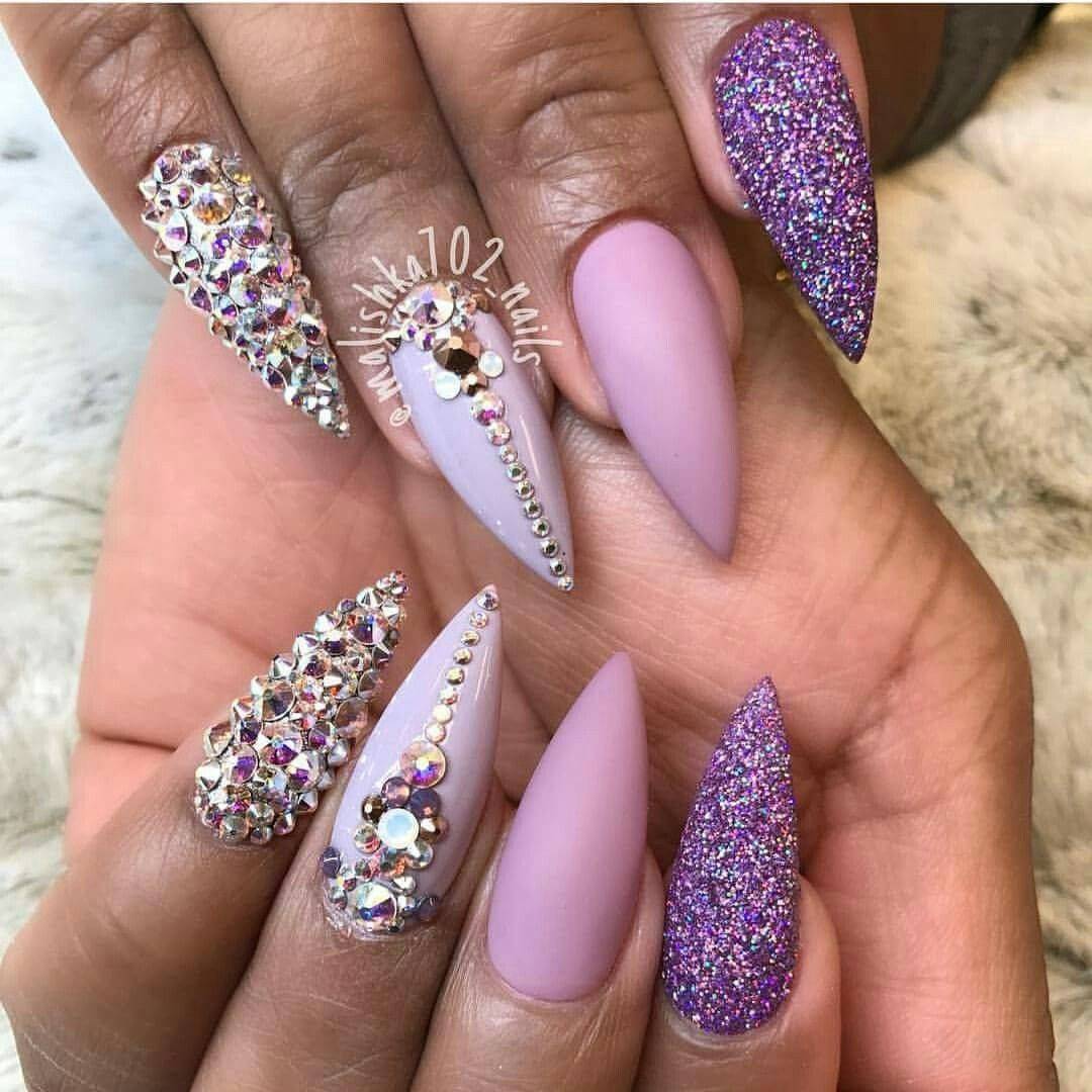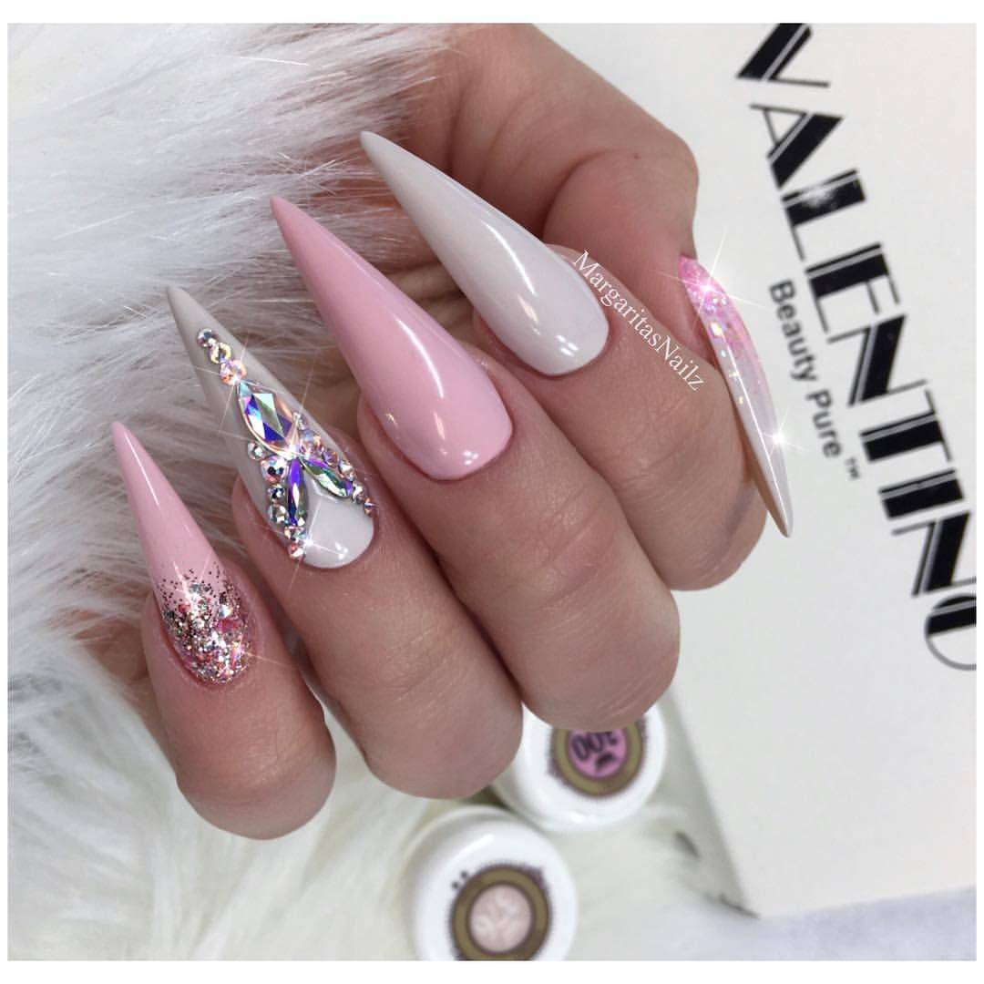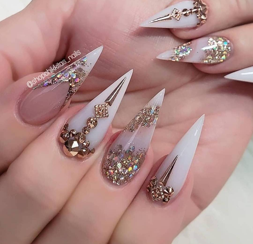 Красивый маникюр на длинные ногти со стразами и блёстками