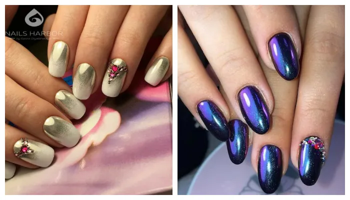 А можно выделить сиянием несколько ногтевых пластин, а декор разместить на соседних ногтях. Перламутровая, жемчужная или голографическая втирка будет использоваться в процессе – решать только вам. Любая из предложенных вариаций смотрится очень красиво и стильно.