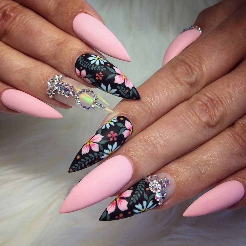 Обладательницы длинных ногтей хорошо знают как облагородить и смягчить свои нейл-арты. Для этого они используют матовую текстуру, меланж, “сахарок” и другой материал, придающий ноготкам бархатистую нежность. Матовый маникюр на острых ногтях может быть выполнен в темных насыщенных оттенках. Чаще всего для дизайна используют бордовый и черный цвета. Стразы располагают классическим способом: в прикорневой зоне, посередине ногтя полоской, поперек ногтя, в виде волны.