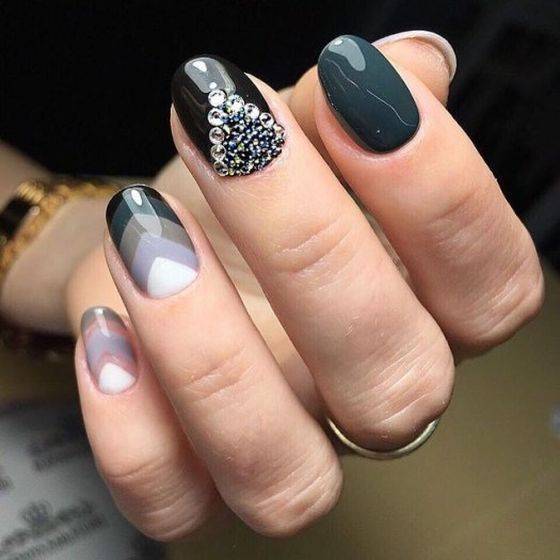 Если вы фанатка декора со стразами, обязательно сделайте черный маникюр. Он выгодно оттеняет блеск камней и декор будет заметным, не потеряется на фоне яркого цвета. Рекомендуем сочетать камни с матовой текстурой, чтобы они солировали в дизайне.