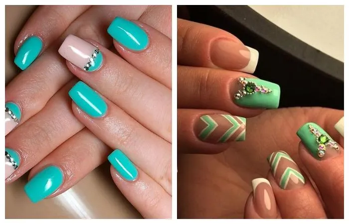 Ногти, окрашенные в мятный и желтый цвета, выглядят модно. Для большей выразительности каждый угол пальца может быть украшен цветными стразами.