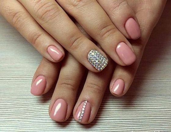 Если вы поклонница стиля минимализм, выбирайте для базы однотонные нюдовые оттенки лака. На них можно создавать целые картины стразами или размещать по одному два камешка у основания (лунулы), края пластины, в самой ее середине.