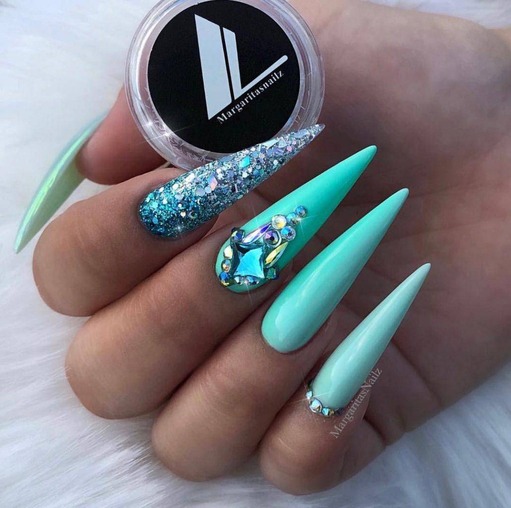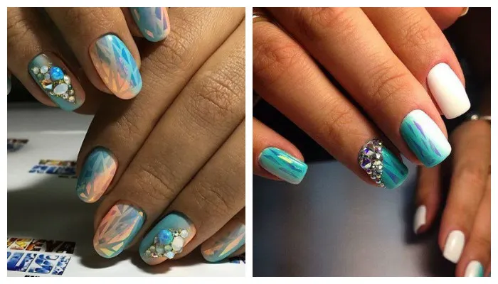 Бирюзовый с мятным дизайном и стразами гель-лак