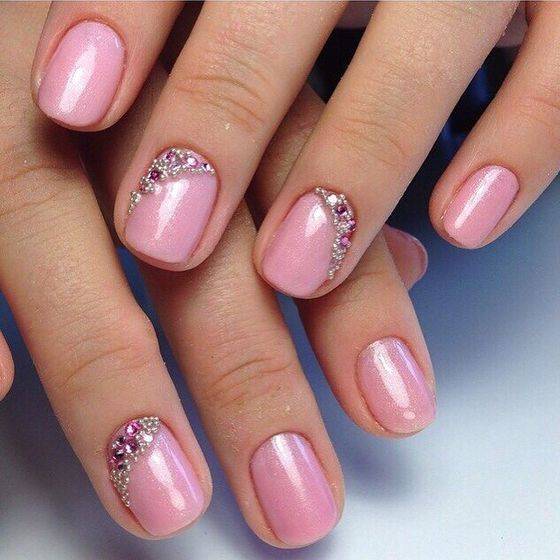 Чтобы маникюр со стразами смотрелся наилучшим образом на коротеньких ногтях ни в коем случае не стоит перегружать их большим количеством камней