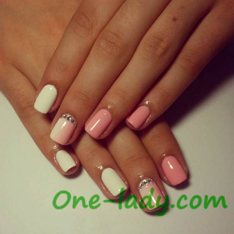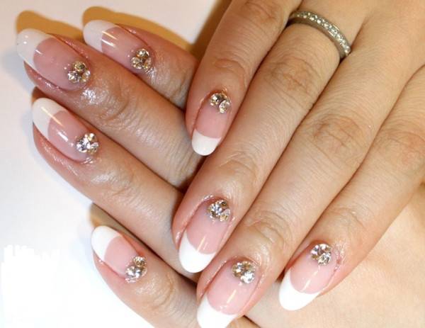 Двухцветный французский маникюр, где пара прозрачных камней выложена с одной стороны каждого пальчика по линии «улыбки».
