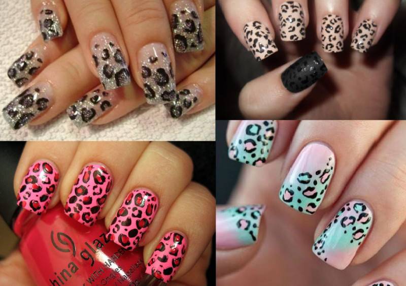 Классический. Нанесение традиционного леопардового рисунка предусматривает применение цветов, которые наиболее близки по оттенку к натуральному окрасу шкуры леопарда. К таким можно отнести все оттенки желтого и коричневого цветов. Градиентный. Очень интересный способ нанесения лака. Суть его заключается в нанесении оттенков одного цвета, от насыщенных у основания ногтя, к более светлым на конце. По самому краю ногтевой пластины наносятся характерные пятнышки. Леопардовый френч. Базовое нанесение лака ничем не отличается от технологии классического французского маникюра. Единственное отличие, леопардовый френч предполагает нанесение по краю ногтя леопардового принта. Такой вид маникюра хорошо подходит для строго дресс-кода или деловых встреч. Он достаточно сдержан в своем исполнении, при этом обладает небольшой изюминкой. Контрастный способ нанесения леопардового принта. В этом случае используются довольно яркие и не вполне приемлемые цвета для данного рисунка, например розовые или синие цвета. Стильный блестящий