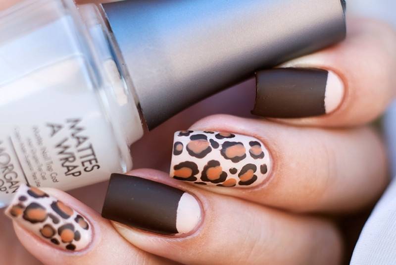 Матовое покрытие. Бесподобно смотрится черный маникюр на матовой основе. Пятна леопарда можно тоже нанести в черном цвете и сделать объемными. Они будут очень интересно выделяться за счет совершенно разных фактур. Этот дизайн также можно дополнить пудрой золотого цвета. Такая идея подойдет для любых других оттенков!