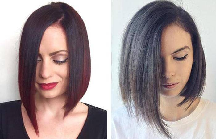 Стрижка каре с удлинением на одну сторону часто выполняется для корректировки формы лица с ярко-выраженной треугольной формой, асимметричность силуэта стрижки существенно нивелирует многие недостатки внешности.