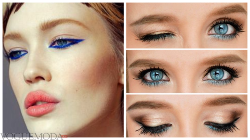 - черная обводка голубым глазам совершенно не подходит, в зависимости от цвета кожи и волос выбирайте золотистый, серый или коричневый оттенок подводки или карандаша;