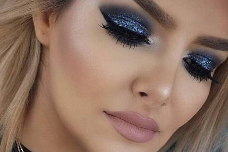 Для фантазийного и праздничного макияжа можно применить оригинальные блестки и ярко-голубые палитры цветов.