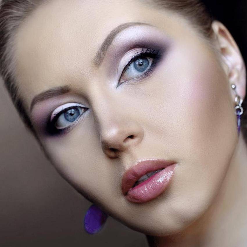 Темные оттенки – это ни в коем случае не черные, не шоколадные и не выглядящие как синяки темно-фиолетовые! Для эффектного выделения светлого взгляда используйте деликатные сливовые тона и серо-коричневые. Все границы наложения светлых, средних и темных теней должны быть тщательно и аккуратно растушеваны. Макияж для голубых глаз не прощает небрежности.