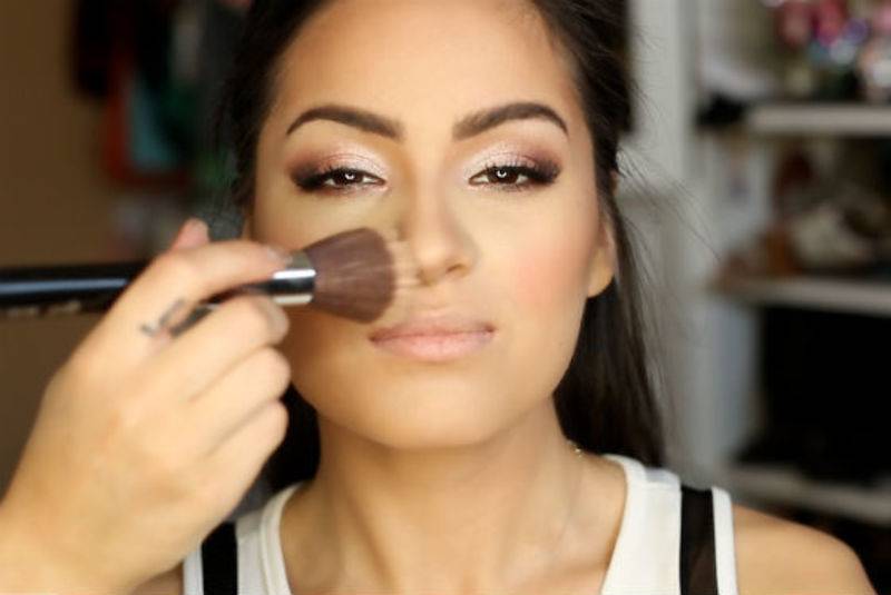 Красивый дневной мейкап нужно дополнить помадой и румянами. Скошенной кистью подчеркивают скулы. Бледная кожа приобретет приятный оттенок при использовании розовой пудры, смуглым девушкам лучше нанести песочную. Не стоит использовать средства с блестками — они подходят только для вечернего макияжа.