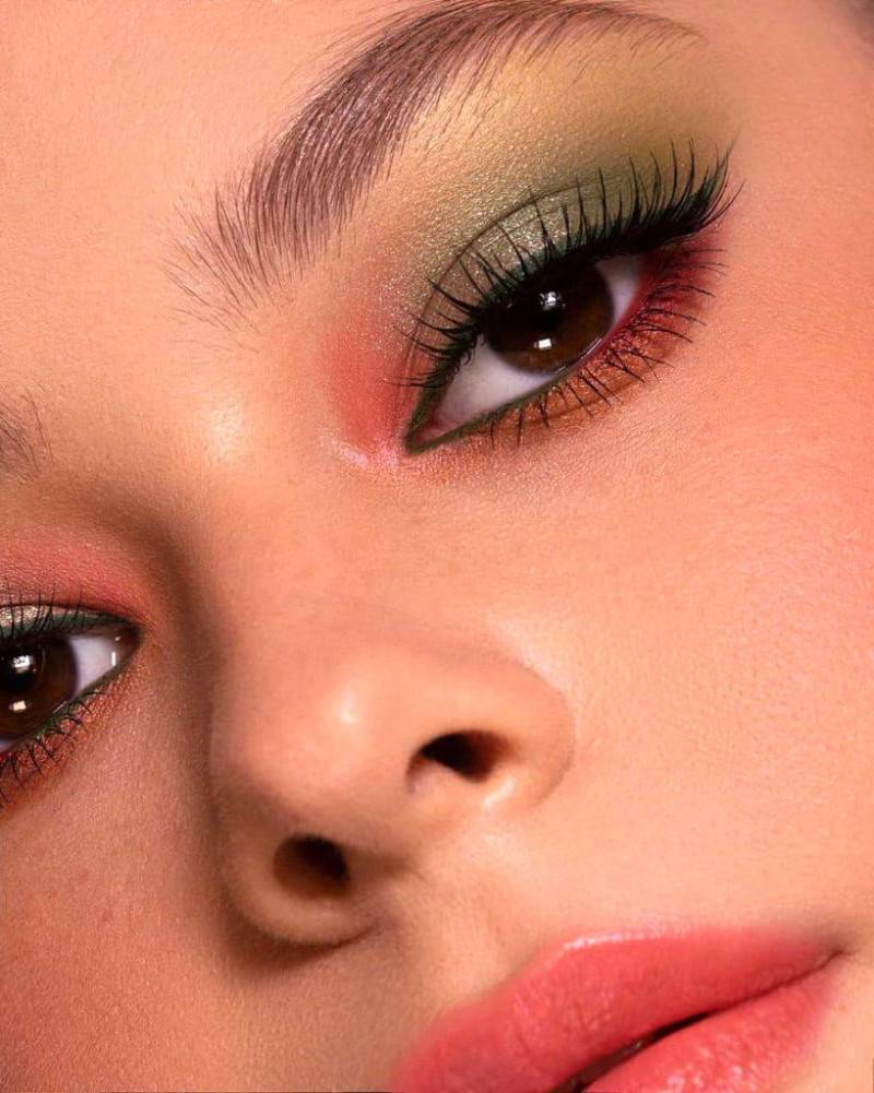 - Для зеленоглазых красавиц подходят теплые оттенки теней: коричневые или розовые. Можно использовать яркие оранжевые тени.