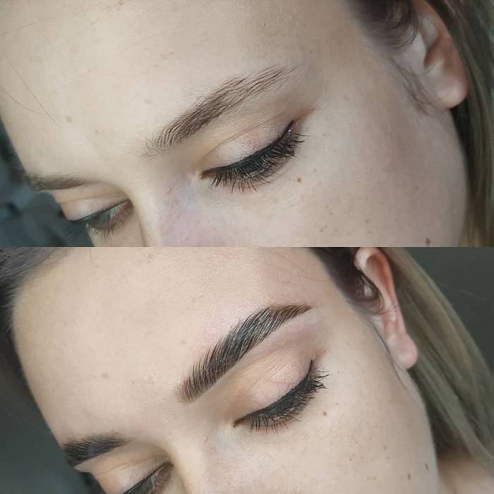 - естественный вид. Бровки после долговременной укладки не выглядят слипшимися, они естественно расправлены, имеют правильную форму без графичных линий, которые бывают при перманентном макияже;