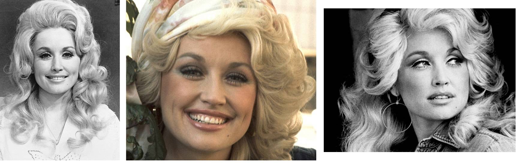 Dolly is known for her exaggerated hair, makeup, and clothing which accentuates her cleavage.