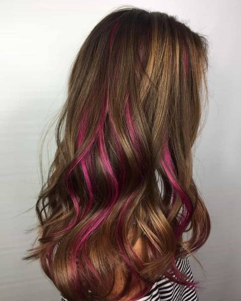 Более сдержанный вариант — расположить мелированные пряди под основной массой волос, чтобы получить одну из вариаций скрытого окрашивания. Плюс такой прически — в том, что она выглядит очень стильно даже без полного перекрашивания волос в нестандартный цвет.