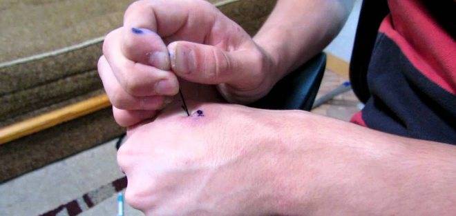 Иголку опустите в чернила, проткните кожу и оставьте небольшую точку. Возможно, появится капелька крови. Иногда возникает небольшой хлопок при проколе кожи.