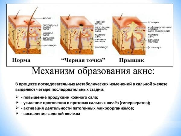 Папулы образуются в результате воспаления комедонов. Это обусловлено тем, что в сальных железах начинают размножаться бактерии, которые в последующем способствуют воспалительному процессу и образованию гноя внутри.