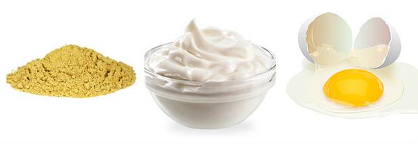 | Горчица — 1 ст. л., сметана (густая) — 1 ст. л., масло оливковое или репейное — 2 ст. л. | Горчицу развести теплой водой, добавить сметану и масло. Хорошо перемешать и использовать | Втирающими движениями нанести на корни волос, оставить на 20-30 минут под шапочкой. Обязательно смыть шампунем |