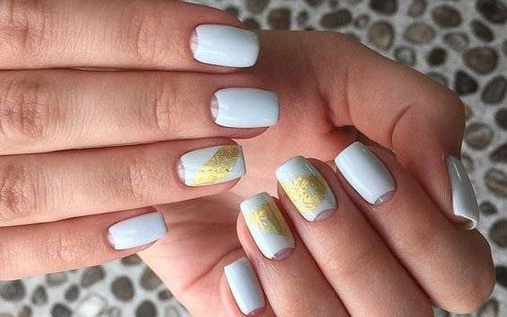 - Золотой. С золотистым лаком для ногтей прекрасно сочетаются серый, коричневый, лазурный, красный и черный.