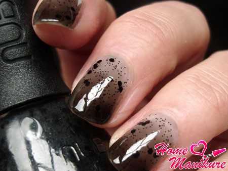 Сначала на подготовленные ногти наносится лак того цвета, что должен быть ближе к кутикуле, а после его полного высыхания при помощи спонжа наносят оттеночный лак другого тона уже у кромки ногтя. Дизайн закрепляют и выравнивают финишным.