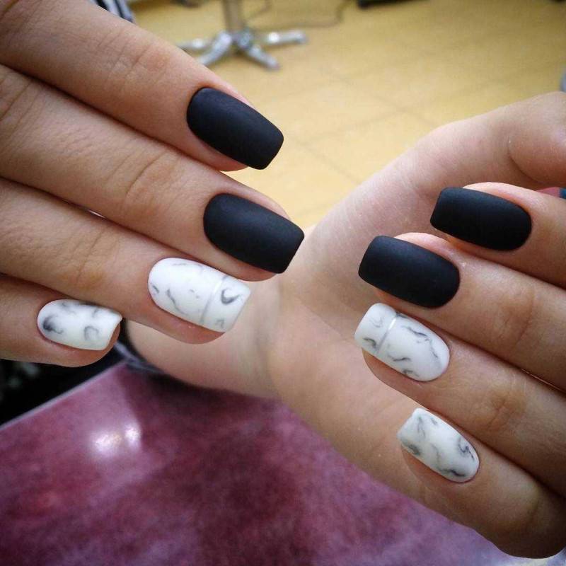 Ахроматическое сочетание включает в себя белый, черный цвет, а также различные оттенки серого между ними. Они великолепно смотрятся в одном маникюре в любой комбинации. Примечательно, что в отличии от предыдущего варианта, с данными оттенками прекрасно сочетаются хроматические тона. В результате получается выразительный, яркий маникюр. Поэтому если вам нравится контрастное сочетание, то смело используйте его для оформления ногтей.